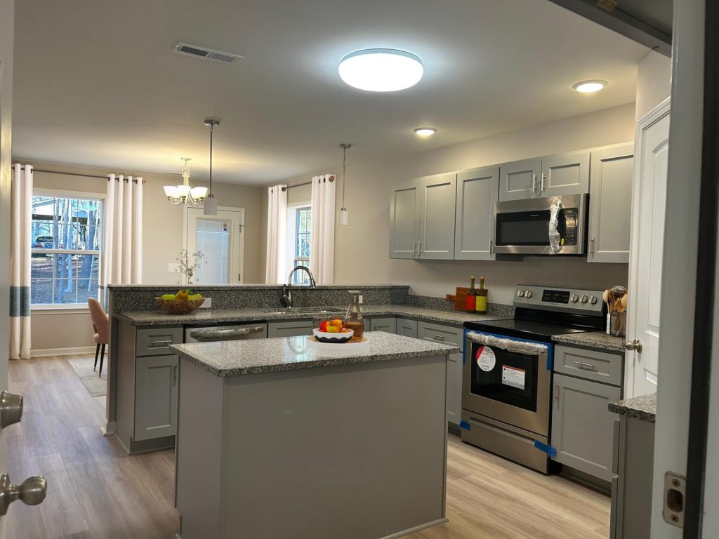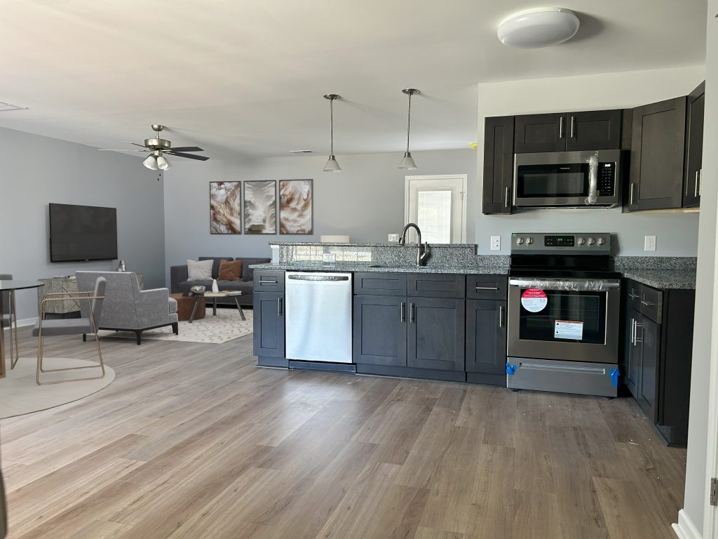 Scratch free and water- resistant enhanced flooring in all rooms except for the bedrooms